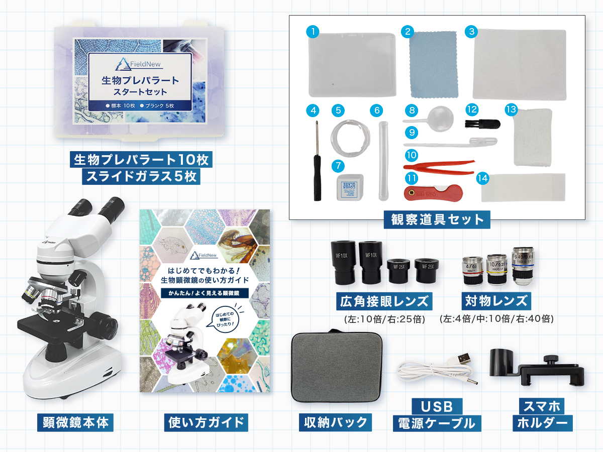 双眼生物顕微鏡 40X-1000X メカニカルステージ 上下LEDライト スターターガイド付 小学生・子供用 自由研究 スマホ撮影対応 保証書付 送料無料 FieldNew