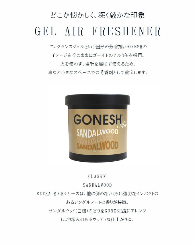 フレグランスジェルという固形の芳香剤。GONESHのイメージをそのままにゴールドのアルミ缶を採用。